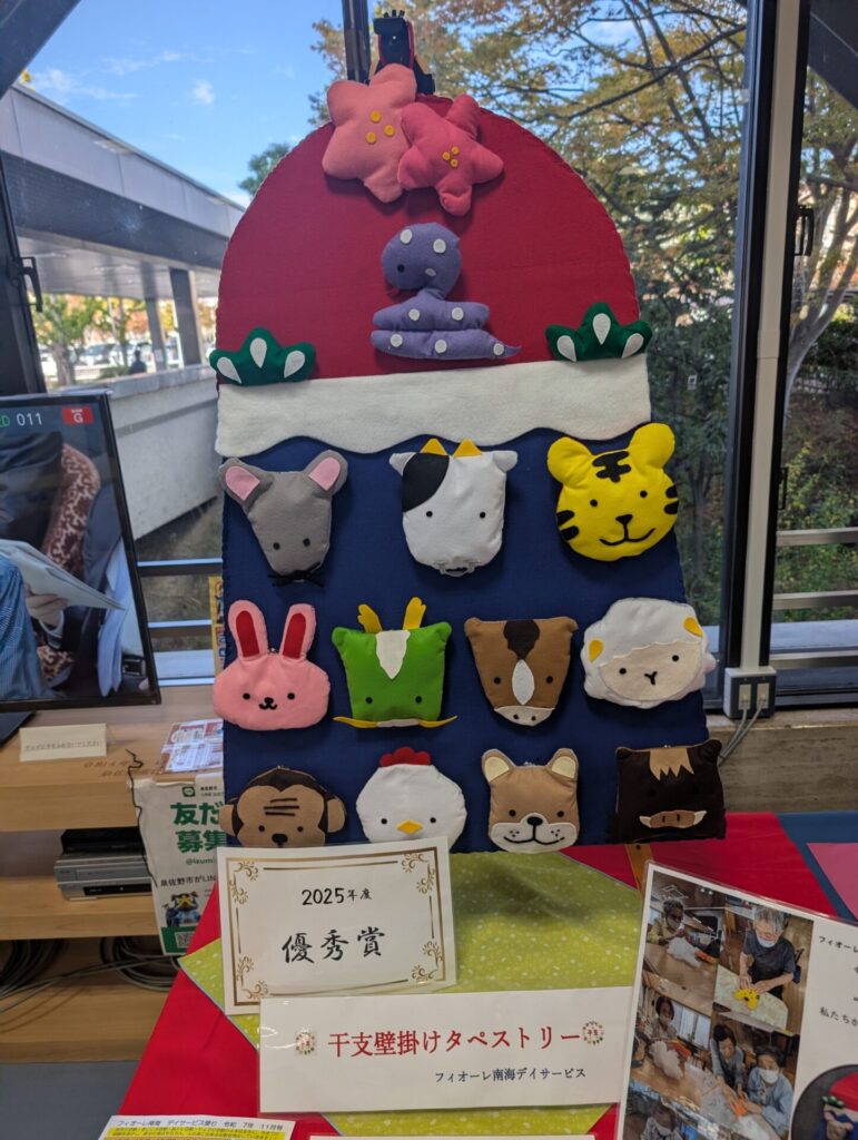 2025.12.01 お知らせ 作品展示会 優秀賞!!! 11月 泉佐野市田尻町デイ・地域密着型合同連絡会にて作品展示会を開催致しました。泉佐野市役所1階ロビーで開催されており、今年も多数のデイサービスが出展されていました。フィオーレ南海は干支をモチーフにした作品を展示したのですが、見事優秀賞を獲得することができました!!!投票に来てくださった方々、本当にありがとうございました。
